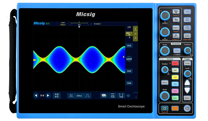 STO1000C系列是Micsig全新發(fā)布的一款便攜式智能示波器。最大帶寬150MHz,采樣率1GSa/s,存儲(chǔ)深度達(dá)28Mpts,最多擁有4個(gè)模擬通道,波形捕獲率高達(dá) 80,000 幀/秒;采用高靈敏度的數(shù)字觸發(fā)系統(tǒng),觸發(fā)抖動(dòng)很小,支持串行總線觸發(fā)和解碼;具備豐富的測(cè)量和數(shù)學(xué)運(yùn)算功能;標(biāo)配數(shù)字濾波模塊;支持256級(jí)波形灰度顯示與色溫顯示;配有LAN、Wi-Fi、USB Host、USB Device、HDMI、Trigger out等豐富端口;配置800*600分辨率的8英寸工業(yè)電容觸控屏與高度集成控制面板,使得該系列機(jī)型支持三種操作模式:全觸控操作、控制面板操作(無(wú)需觸屏)、觸控與控制面板混合操作,結(jié)合Micsig獨(dú)有的觸控算法專利技術(shù),將用戶體驗(yàn)提升到一個(gè)全新的高度。