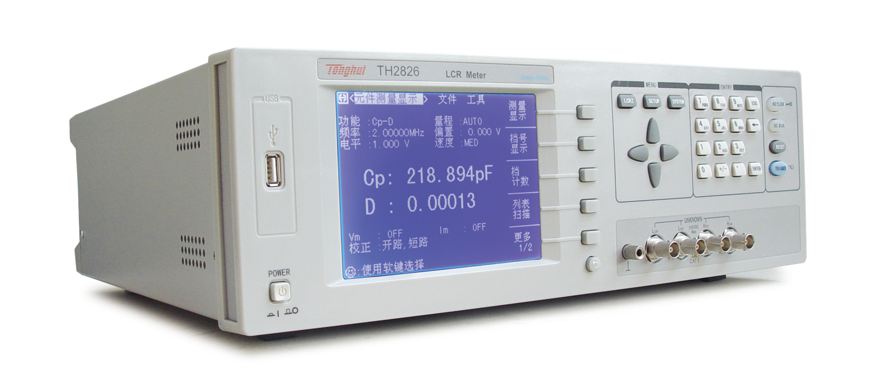 TH2826 高頻LCR數字電橋簡介應用■無源元件?電容器、電感器、磁芯、電阻器、壓電器件、變壓器、芯片組件和網絡元件等的阻抗參數評估和性能分析■半導體元件?LED驅動集成電路寄生參數測試分析;變容二極管的C-VDC特性;晶體管或集成電路的寄生參數分析■其它元件?印制電路板、繼電器、開關、電纜、電池等的阻抗評估■介質材料?塑料、陶瓷和其它材料的介電常數和損耗角評估■磁性材料?鐵氧體、非晶體和其它磁