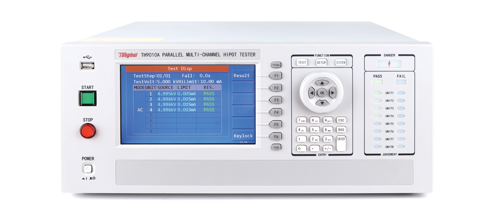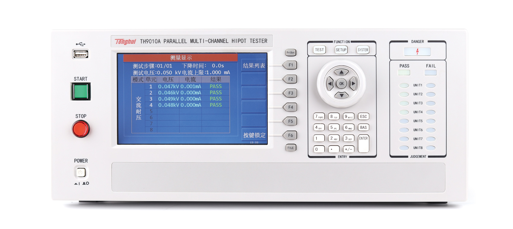 ■?TH9010多路交直流耐壓絕緣測試儀,是一款多通道并行測試、小功率智能安規測試儀器。實現多個產品同步測試,按路分別判斷測試結果。 可以大大加快產品的測試速度,更方便的配合自動化設備實現快速測試。