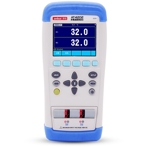 AT4202手持式多路溫度測試儀采用高性能32位ARM微處理器控制,可同時對2路溫度數據進行采集,上超下超報警和通訊傳輸,兼容K/N/E/J/T/R/S/B型熱電偶,響應速度快,數據穩定,同時具備斷偶檢測功能。超低功耗設計和高密度SMD裝配工藝,真彩TFT液晶顯示屏,并具有鍵盤,觸摸屏 雙控制。采用鋰電池供電,USB通訊。中英文操作界面可快速切換。儀器標配的數據采集軟件為您進行數據分析提供強有力的支持!