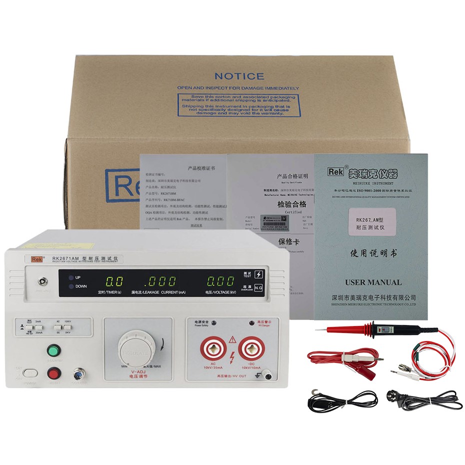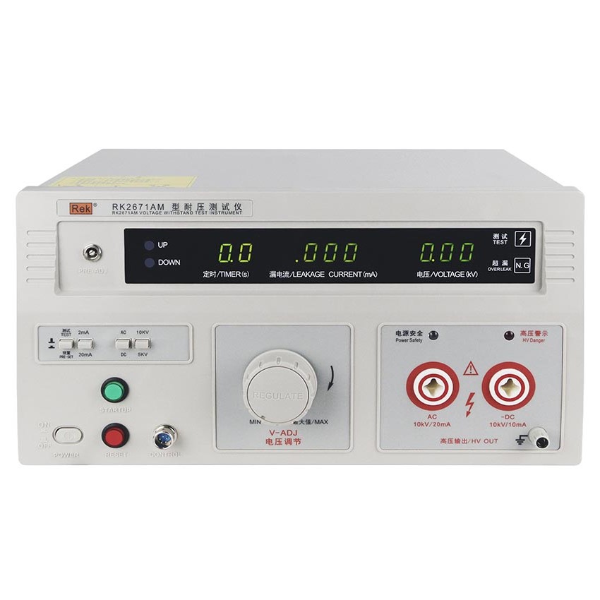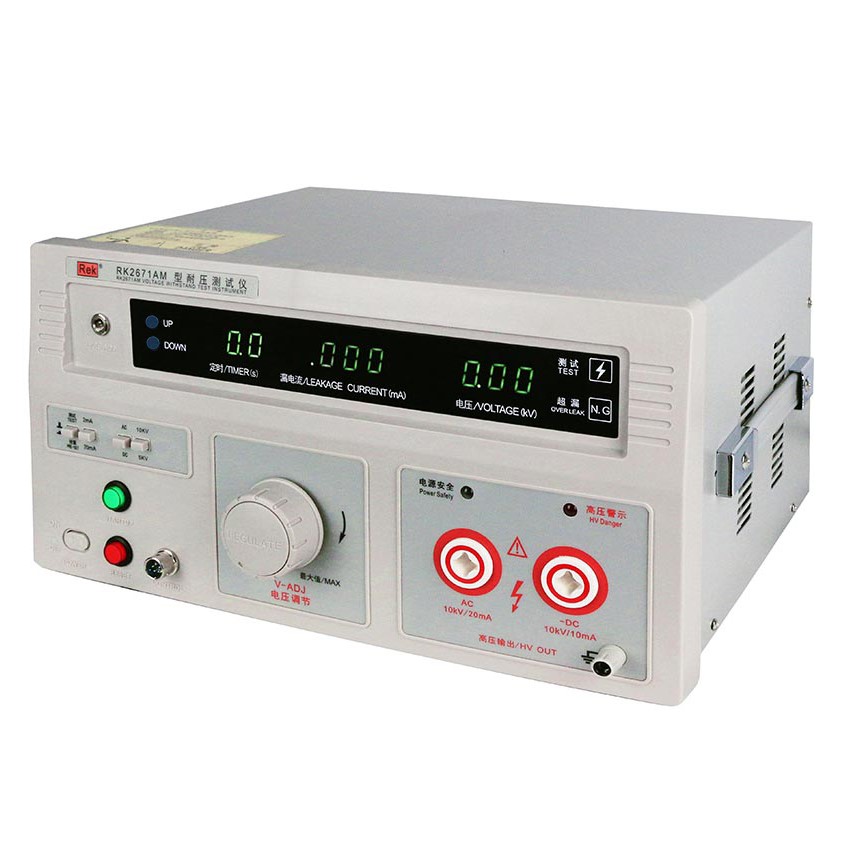 美瑞克RK2671系列耐壓測試儀是測量耐壓強度的儀器,可以直觀、準確、快速地測試各種被測對象的擊穿電壓、漏電流等電氣安全性能指標,并可以作為高壓源用來測試元器件和整機性能。