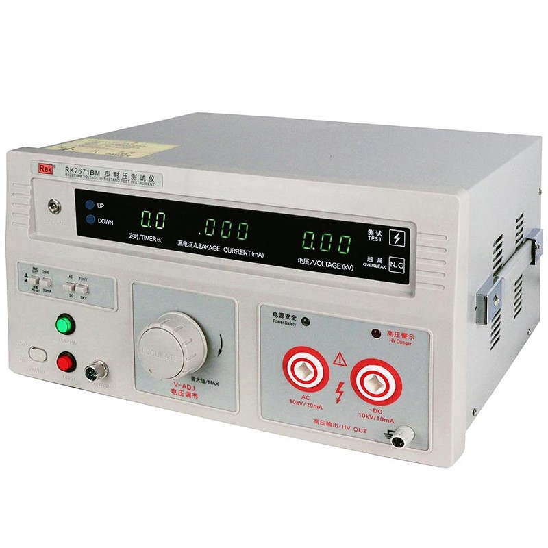 美瑞克RK2671系列耐壓測試儀是測量耐壓強度的儀器,可以直觀、準確、快速地測試各種被測對象的擊穿電壓、漏電流等電氣安全性能指標,并可以作為高壓源用來測試元器件和整機性能。