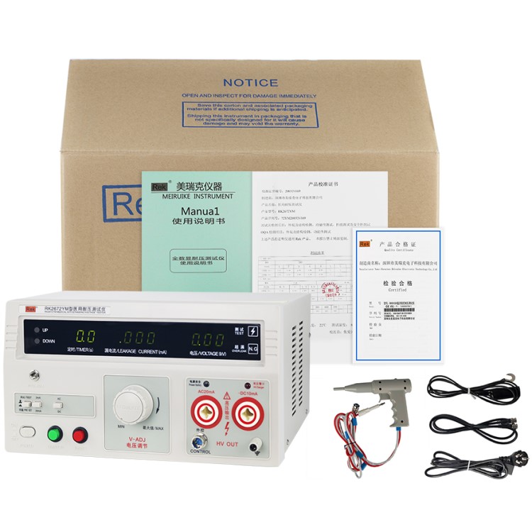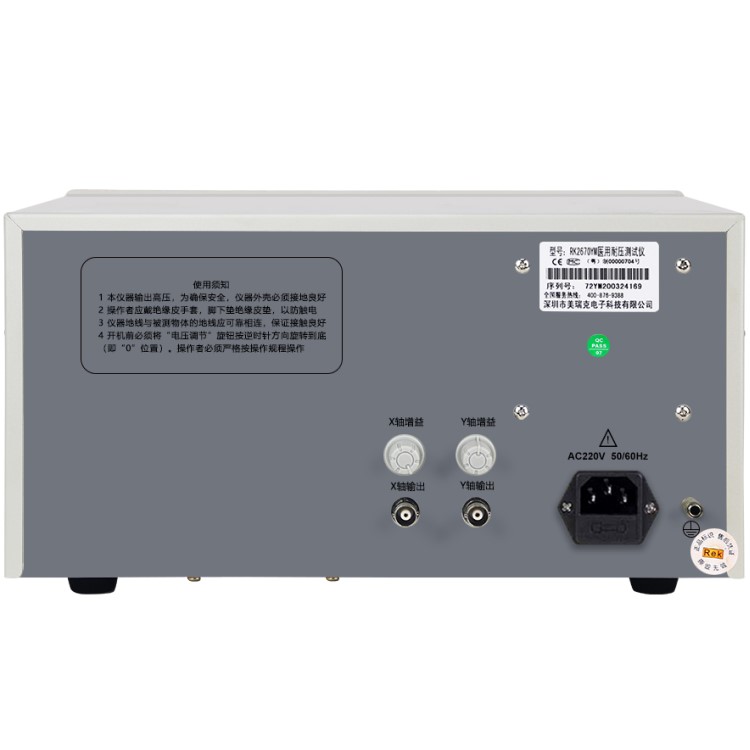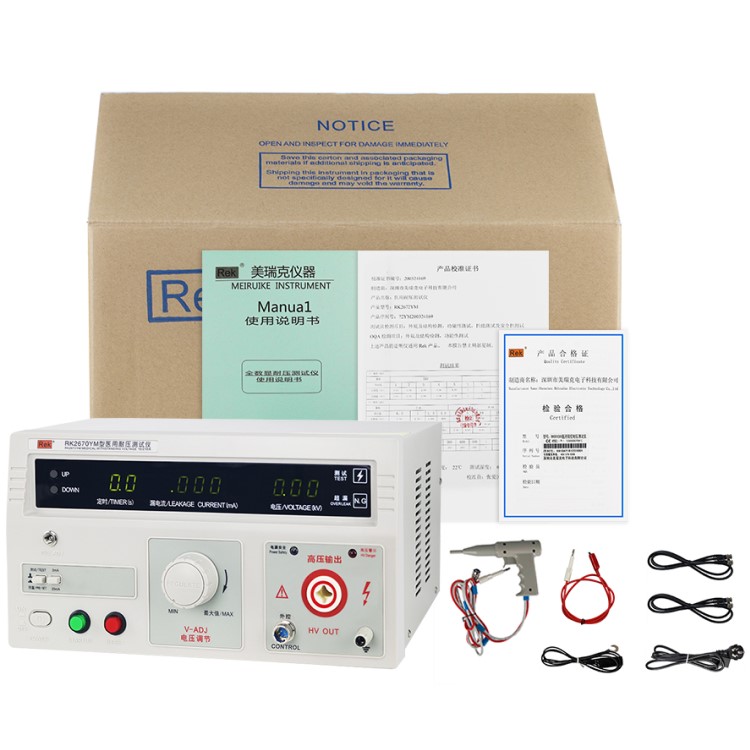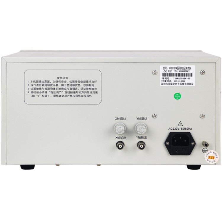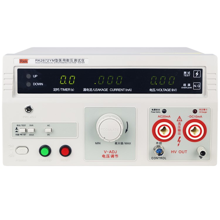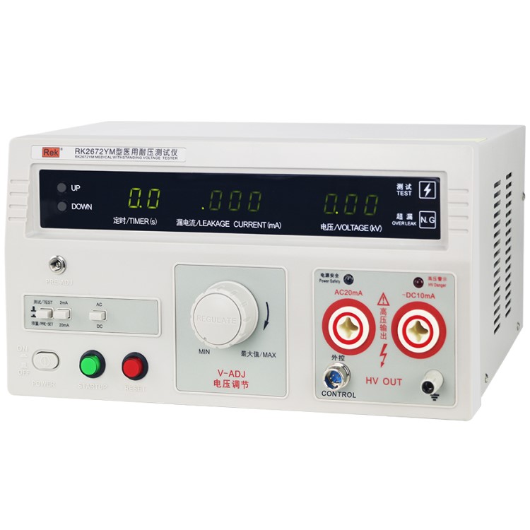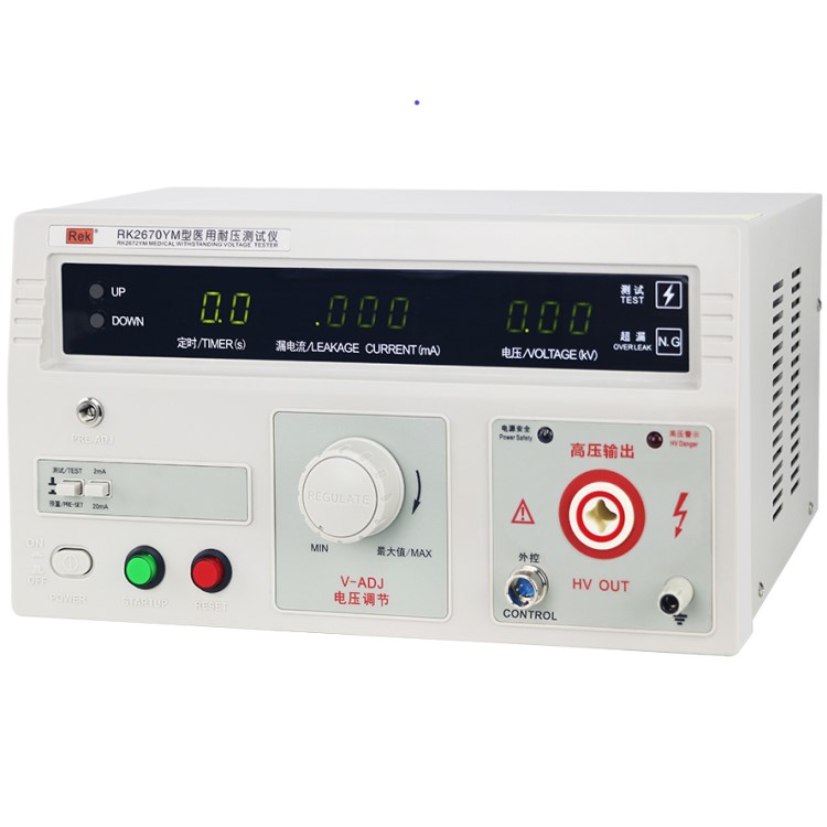 RK2670YM/RK2672YM醫用耐壓測試儀具有常規耐壓側儀所有的功能外,增加了電?。ㄩW絡)偵測功能,通過外接示波器,可以直觀、準確、快速、可靠的檢測到被測電氣設備的“閃絡”現象,被測電氣設備無“閃絡”現象時,示波器顯示一個穩定的“李沙育圖形(即一個閉合的圓環)”,若被測電氣設備發生“閃絡”現象,則李沙育圖形的邊緣會出現較大的電氣設備發生“閃絡”現象以保證被測電氣設備的安全。本產品同時也適合需要檢測“閃絡”缺陷各種電氣設備等,是醫用電氣設備制造商、維修部門、使用單位以及產品質量檢測部門、技術監督部門不可少的耐壓測試儀。